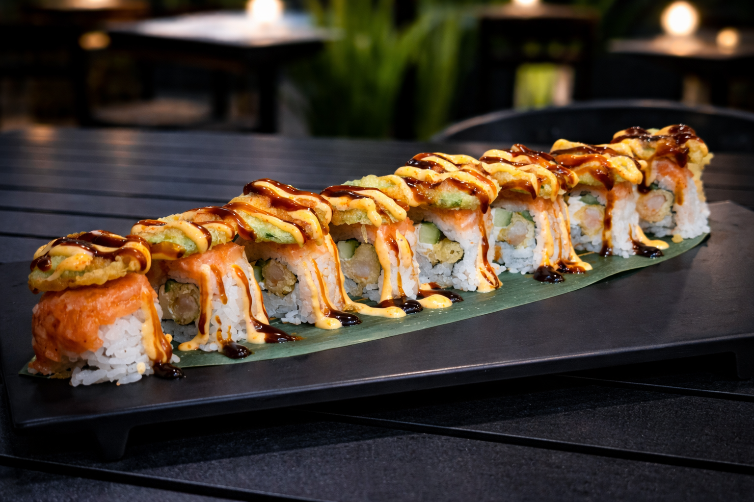 OUTSIDE: Spicy Salmon, Sliced Lemon, Fried Jalapeno, topped with Spicy Mayo, Eel Sauce, & Spicy Ponzu Sauce