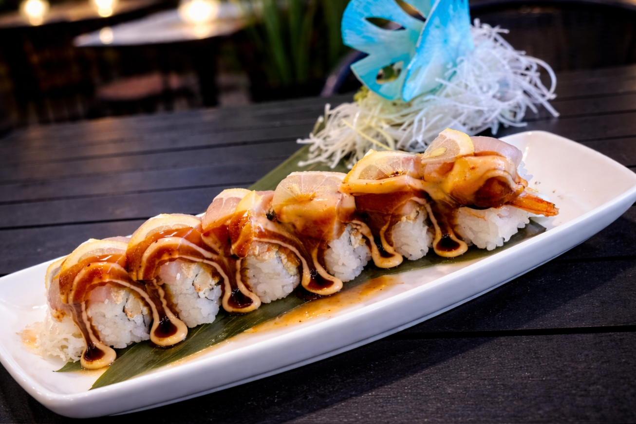 OUTSIDE: Yellowtail topped with Orange Slices, Green Onions, Spicy Ponzu, & Yum Yum Sauce